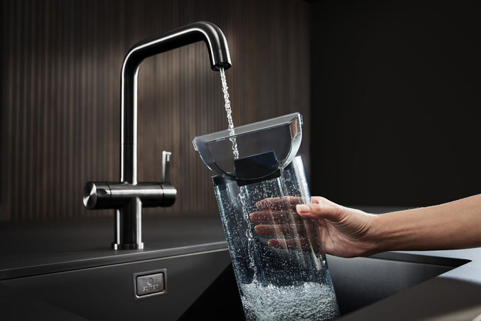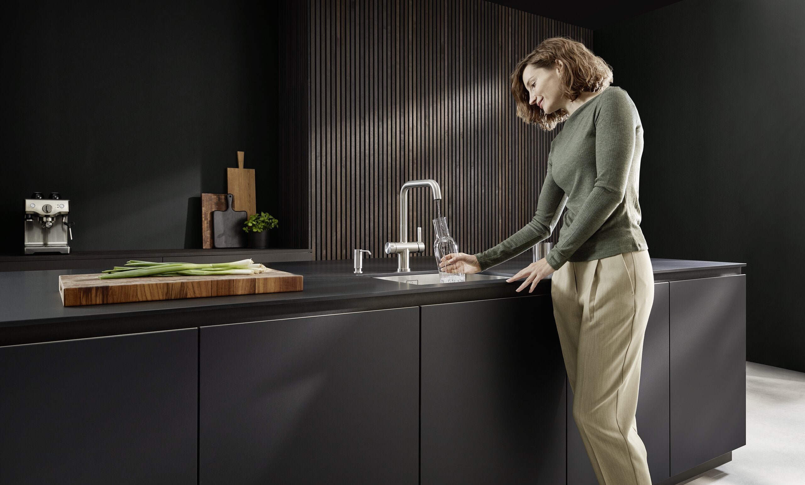 Μπαταρία κουζίνας με φίλτρο νερού, κατασκευασμένη από υψηλής ποιότητας ανοξείδωτο ατσάλι V4A με αντιβακτηριακές ιδιότητες, που εξασφαλίζει μέγιστη καθαρότητα και υγιεινή.